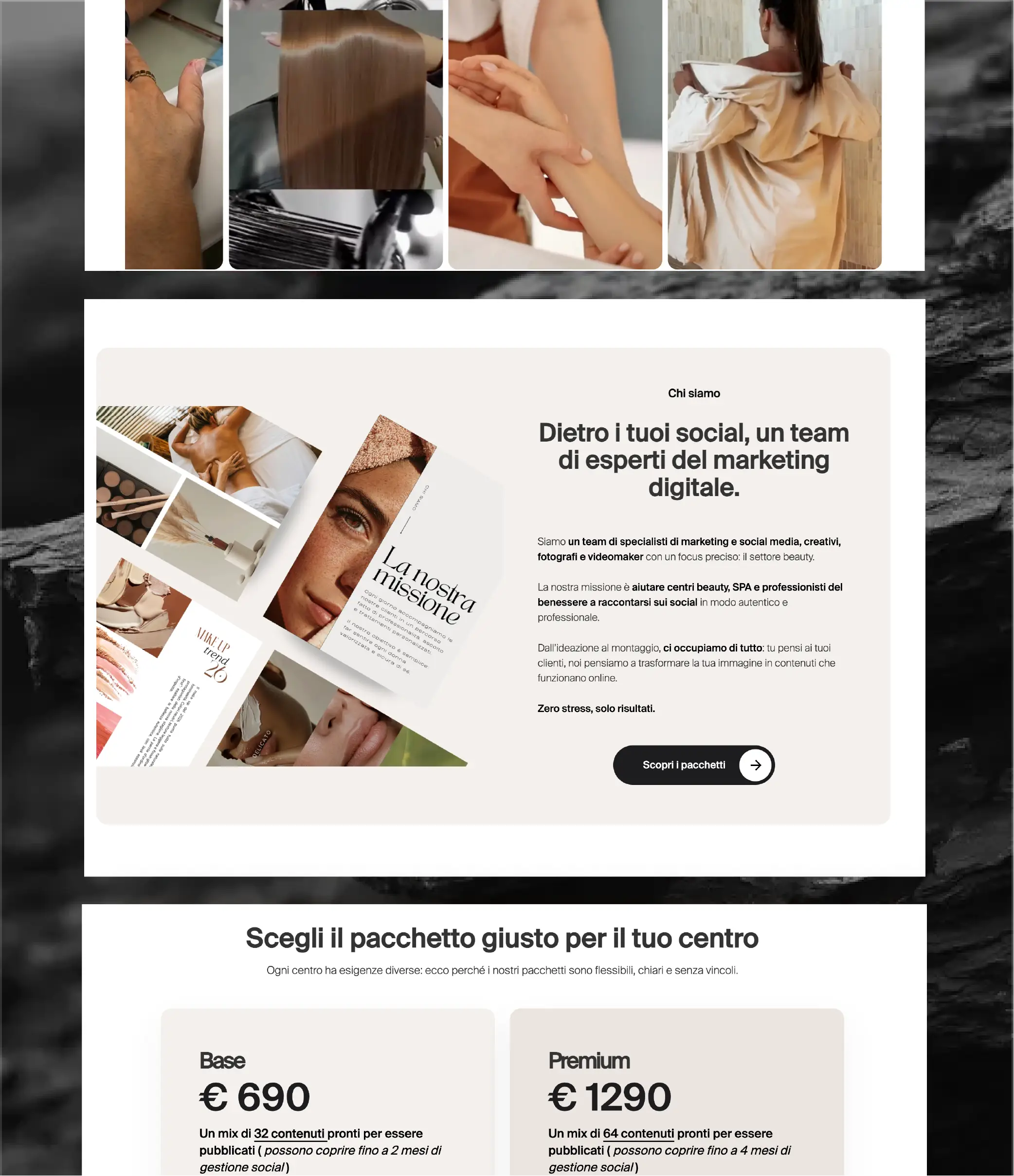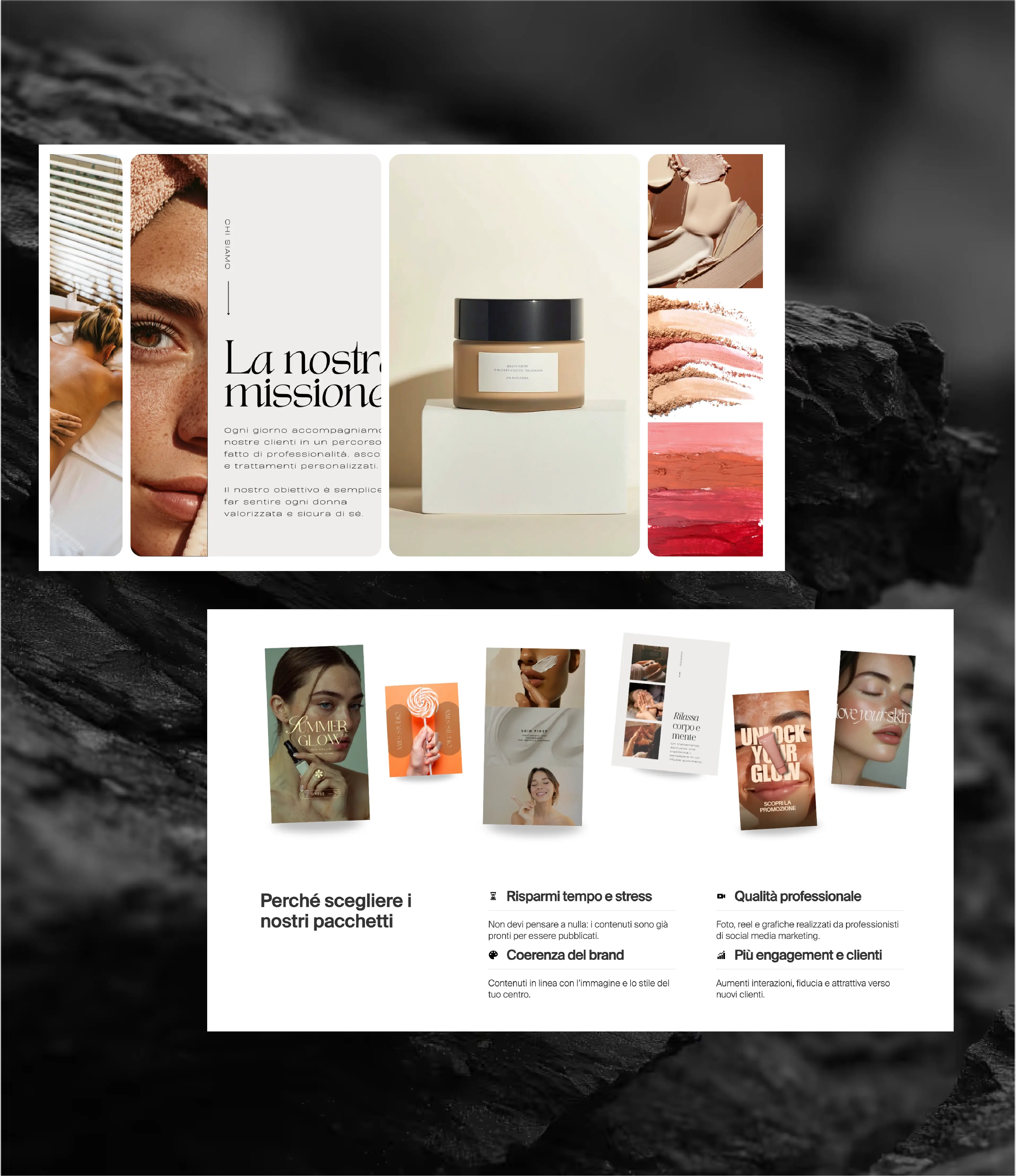 CASE STUDY: ELEVATE STUDIO | L’obiettivo era creare una landing page dedicata al servizio “Elevate Social”, pensata per valorizzare la proposta rivolta ai centri estetici e ai brand del mondo beauty. La pagina doveva comunicare con chiarezza, leggerezza e coerenza visiva i punti di forza del servizio, mantenendo l’equilibrio tra tono professionale e stile contemporaneo. Mi sono occupata di web design, UX e contenuti, definendo layout, struttura e copy per guidare l’utente in un percorso fluido e naturale fino alla CTA. Oggi faccio parte del team di Elevate Studio, seguendo il progetto anche nella sua evoluzione strategica e creativa. La nuova landing comunica in modo semplice e professionale la proposta di valore del servizio “Elevate Social”. Ha permesso all’agenzia di presentarsi con un’immagine coerente e curata, diventando una vetrina efficace per i propri servizi nel settore beauty. In qualità di membro del team, continuo a seguire il progetto come digital strategist e content designer, contribuendo all’evoluzione del brand e delle sue campagne future.